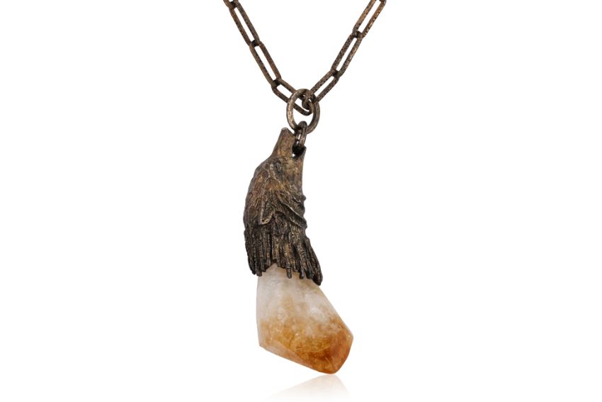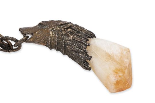 With citrine set to blackened silver mount in the form of a howling wolf with matching blackened silver chain. Marked for Prada and '925' for sterling silver. Made in Italy