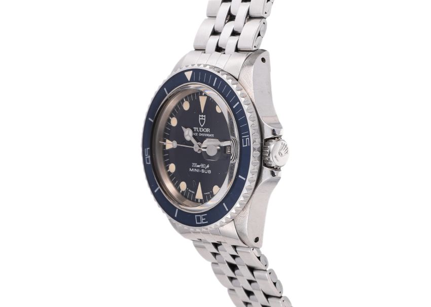 Stainless steel case with blue enamelled rotating bezel, blue dial with luminous markers and hands, date register at three o'clock, equipped with an ETA 2671 automatic movement, on a stainless steel Tudor bracelet