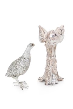 Comprising: a foliate design bud vase; five small silver plated and glass birds; a pierced model of a partridge; and a heart shaped box and cover