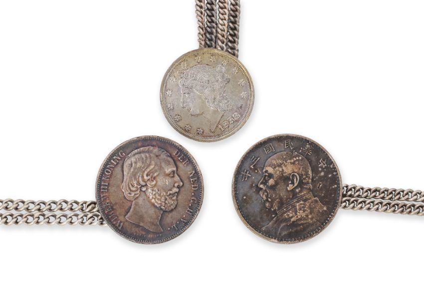 All of matching form with long curb link chain and single coin, comprising examples with a Willem III 1870 2 1/2 Gulden; one with a Yuan Shi Kai Dollar 1914; and one with a 1938 "Flower Prize" medallion