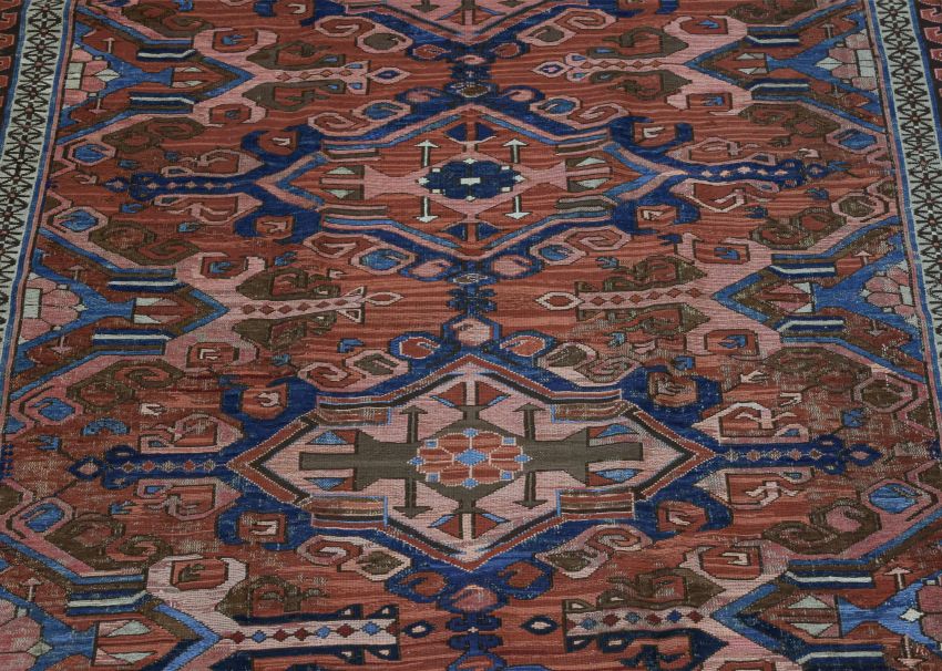 Circa 1920-30s, hand knotted wool rug in red, blue and pink