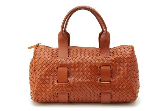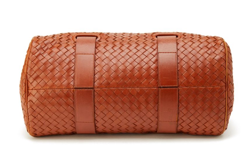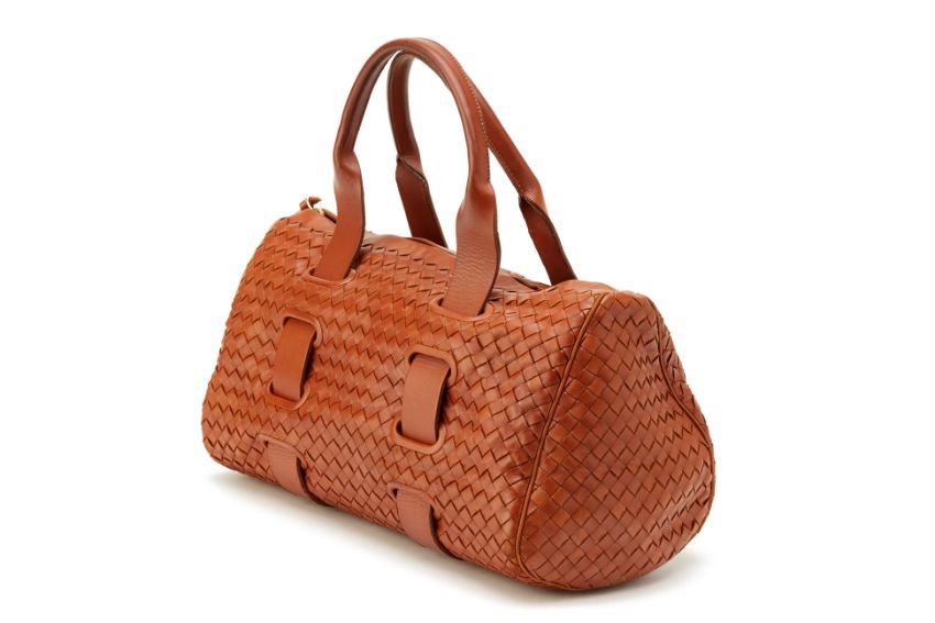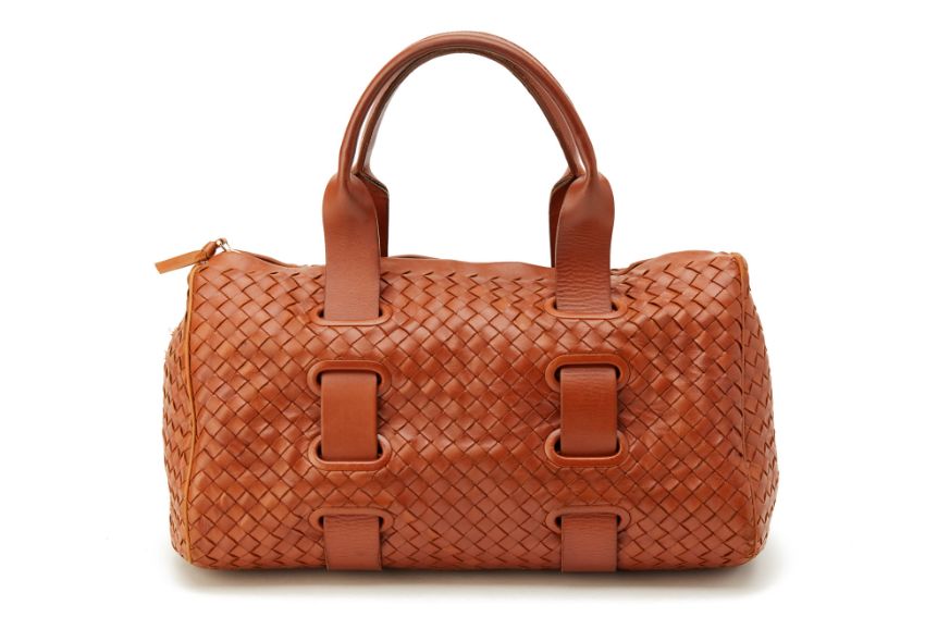 Beautiful soft brown woven leather bag with leather strap detail going around the bag with one internal zipped pocket