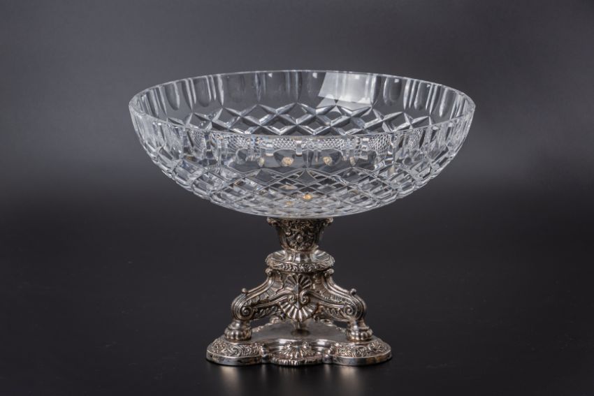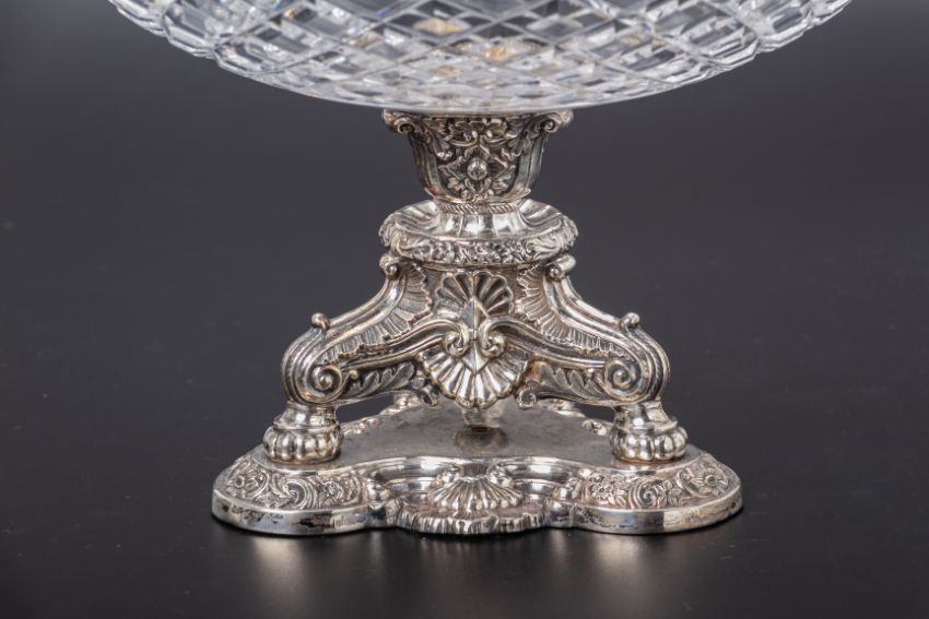 The cut glass bowl supported on a triform base decorated in relief with acanthus, scrolls and other foliage, marked '13' to the base