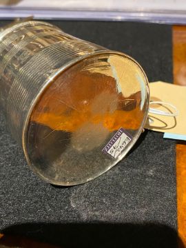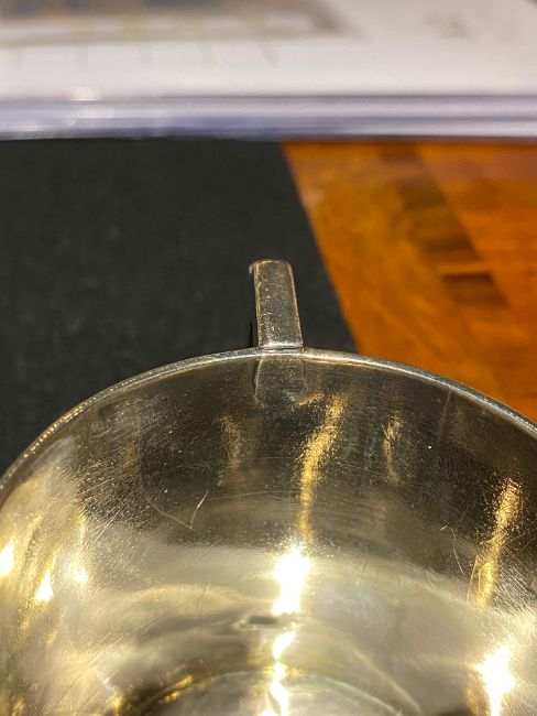 Marked to right of handle, marks with some rubbing but all legible. A small split to the rim at upper junction of handle the lower junction pushed in slightly. Initials to front are crisp. Some abrasion to underside.