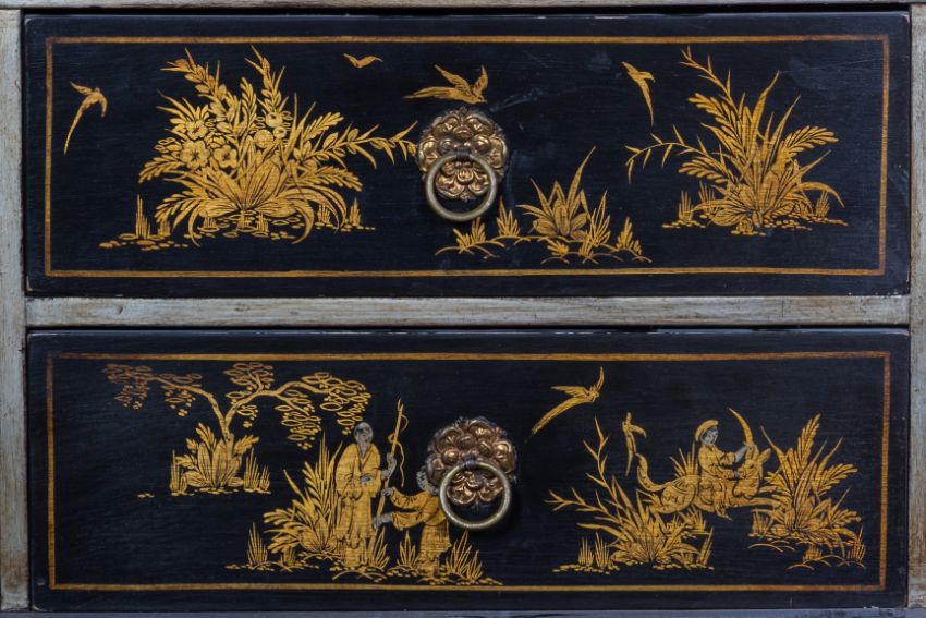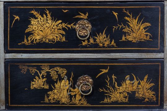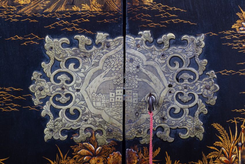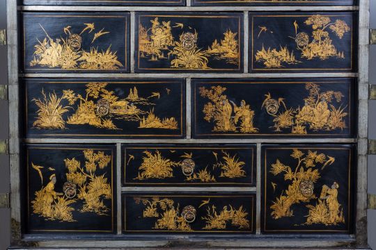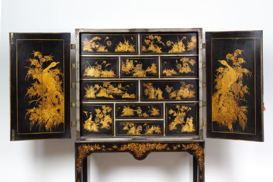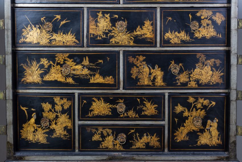 With engraved brass mounts, the lock plate featuring a view of a castle in a landscape, the doors decorated with oriental figures in a chinoiserie landscape, the interior with an arrangement of eleven drawers, with drop ring handles and further chinoiserie decoration