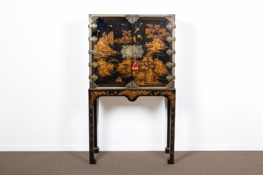 A BRASS MOUNTED BLACK JAPANNED CABINET ON STAND