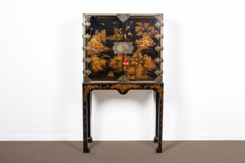 Condition: A vertical split to both cabinet doors, the doors bowed slightly and a slight gap between the doors where they meet. Key present and lock functioning. One drawer lacking section of base, one with split to drawer base. So chipping and general wear to laquer on interior. The top with scuffing and wear. The stand with scuffing and chips to edges.