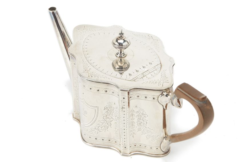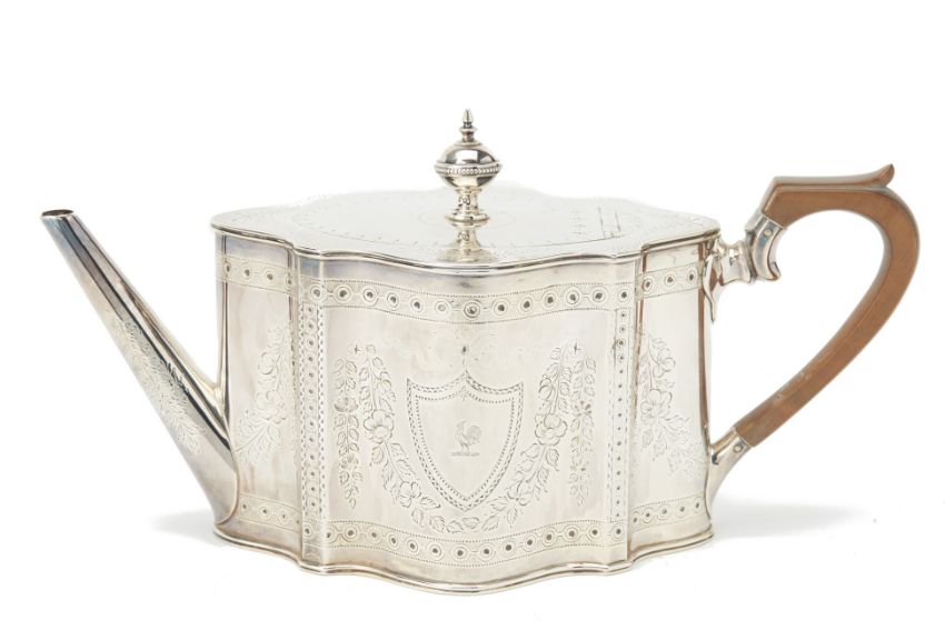 Of George III style, shaped oval form with straight spout and hinged cover, engraved decoration of floral swags and ribbon tied bows, a crest of a cockerel within a shield shaped reserve