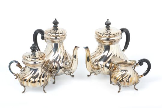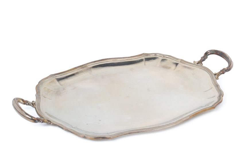 Mid-late 20th Century, Of wrythen fluted form, the tray of shaped oval form with c scroll handles