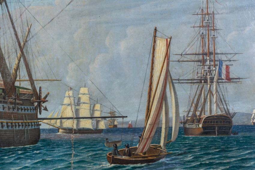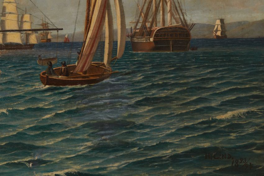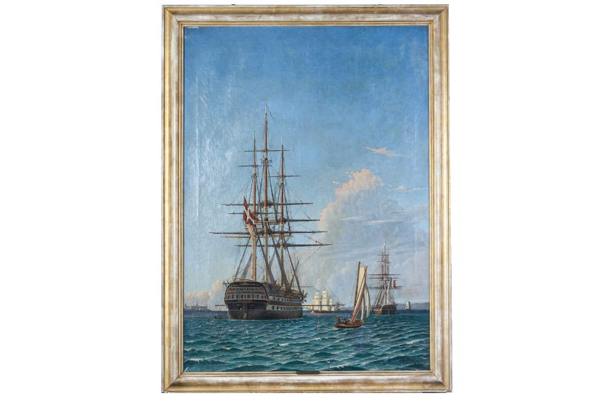 HDMS Dannebrog at anchor and other shipping off a coastline