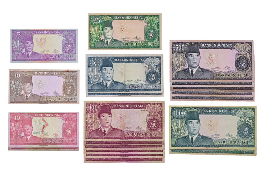 Comprising: 1000 Seribu Rupiah (2), 500 Lima Ratus Rupiah (5), 100 Seratus Rupiah (6), 50 Lima Puluh Rupiah (2), 25 Dua Puluh Lima Rupiah (1), 10 Sepuluh Rupiah (one brown, two red), 5 Lima Rupiah (1); various condition (folds, creases, tears, foxing)