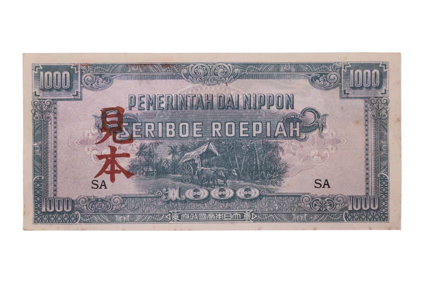 Netherlands Indies Pemerintah Dai Nippon, Japanese Occupation, red overprint at left; foxing, creases; the note comes in the collector's plastic sleeve (not sealed)
