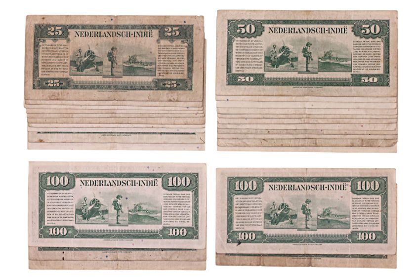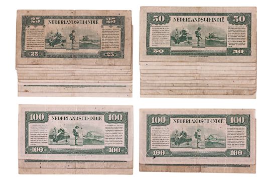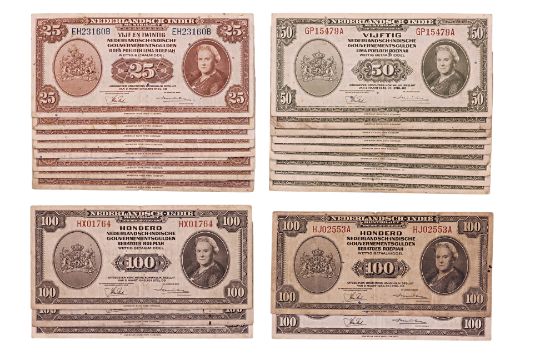 Comprising: 1943 25 gulden Wilhelmina; 1943 50 gulden Wilhelmina; 1943 100 gulden Wilhelmina; various condition (wear, folds, creases, foxing, stains)
