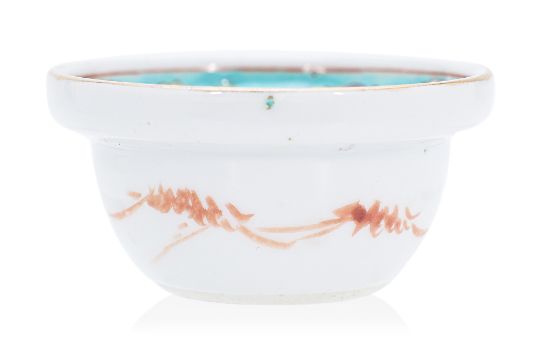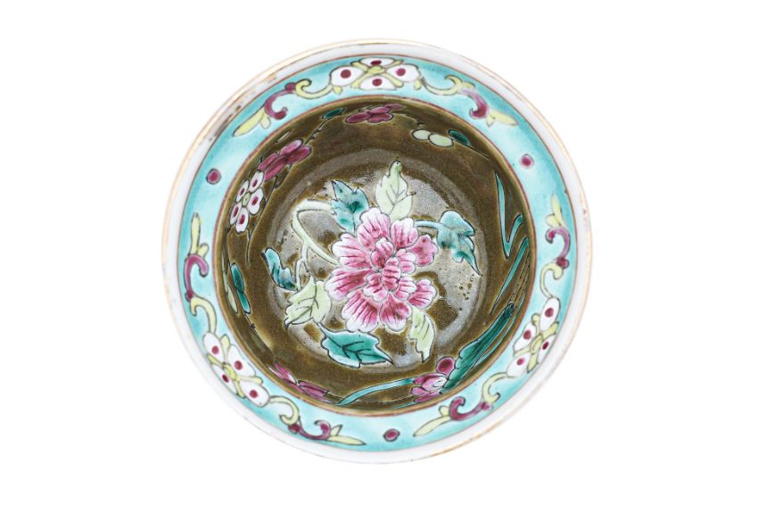 Well decorated in peony, plum flower and lotus, turquoise band of stylised floral scrolls