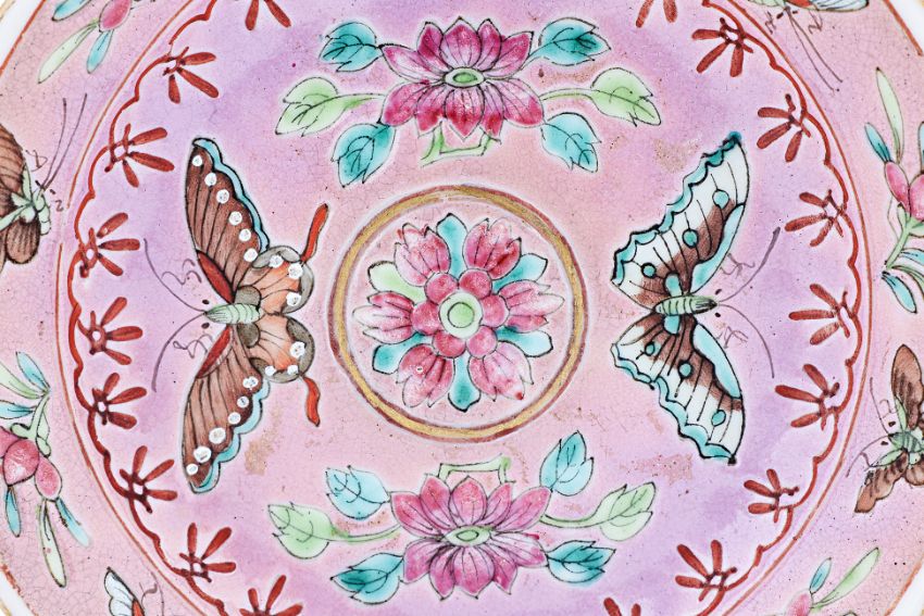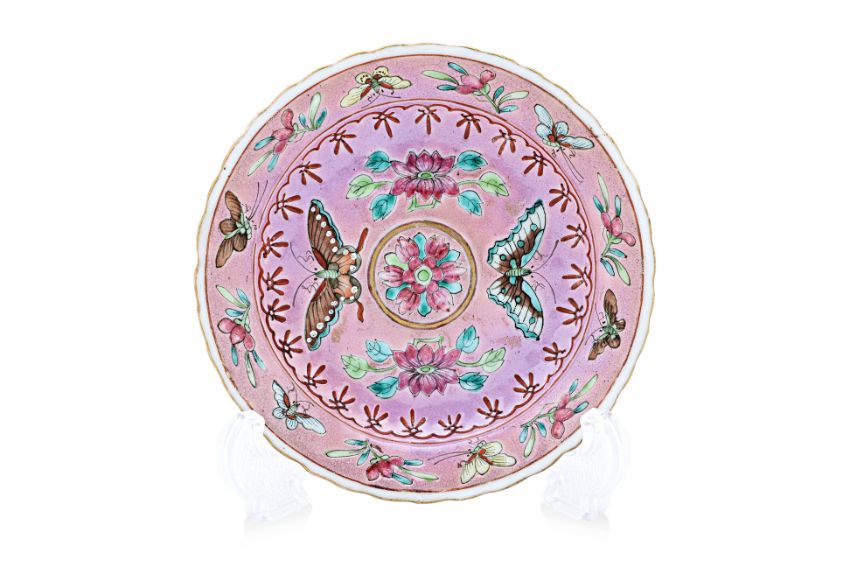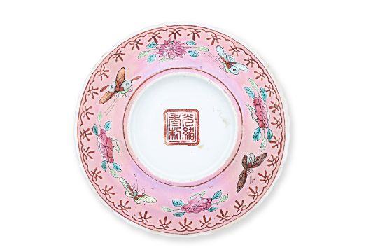 Decorated with central medallion surrounded by butterflies and lotus flowers, within a belt with butterflies alternating with flowers, the reverse decorated with butterflies, peonies and chrysanthemum on pink ground