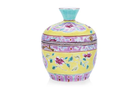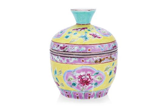Decorated in peony, two pink peony panels, pink Buddhist emblem bands, stylised lotus base