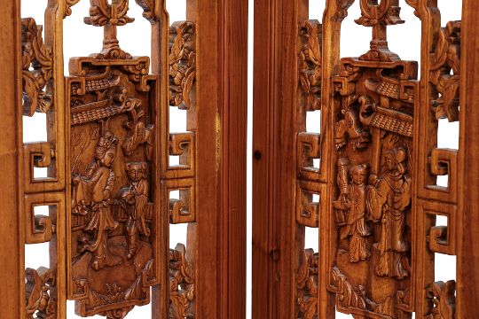Carved openwork panels of garden scenes, auspicious bats to upper, lower with solid panels with archaistic carved design