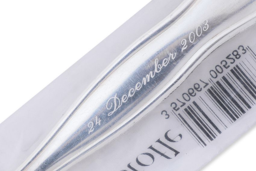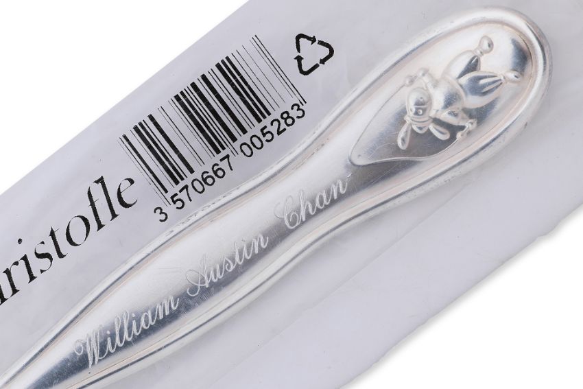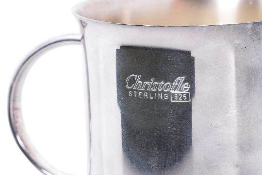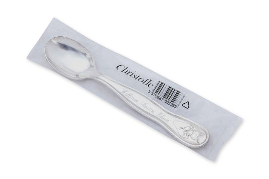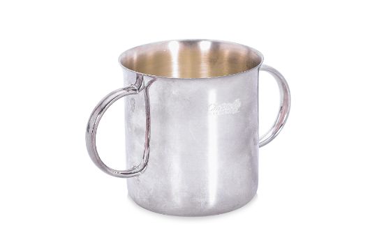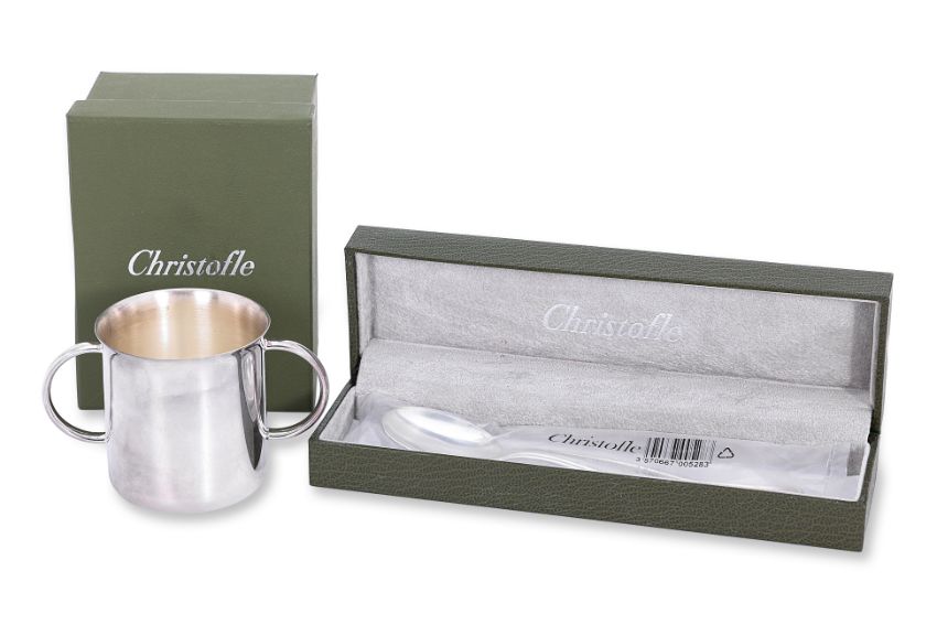 The cup silver sterling 925 double-handled, marked and with monogram at base; the spoon silver plated, marked to bowl, shaped handle inscribed and dated at reverse; both with presentation boxes, the cup with anti tarnish bag