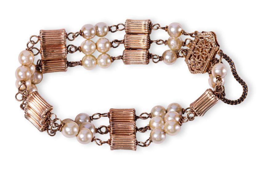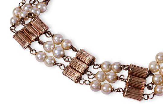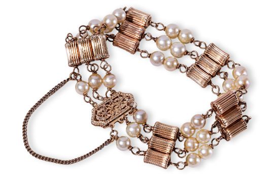 Featuring cultured pearls measuring approximately 5-6mm, mounted in a yellow gold setting with textured gold spacings, safety link and a filigree clasp, marked '14K' to the clasp.
