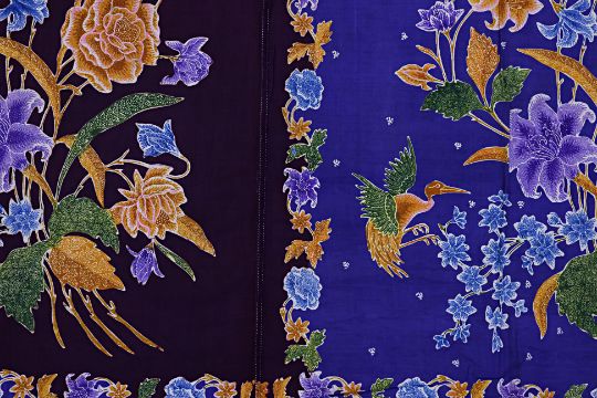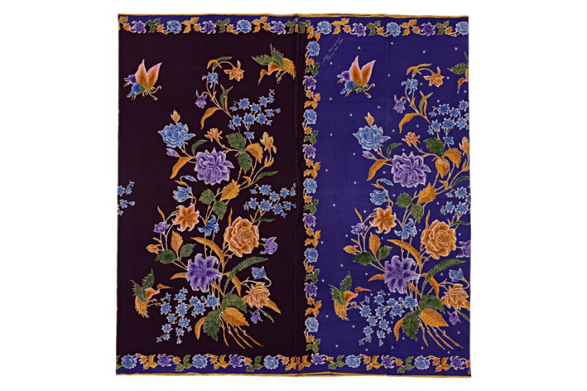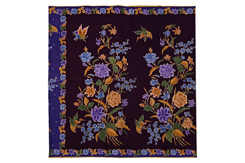 Signed 'Siauw Bie Liem', C. 1930's, decorated with floral, crane and butterfly motifs on a violet base on front panel, and burgundy body