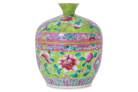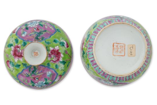 Decorated with shaped oval pink panels featuring a flying phoenix and peonies, on a floral decorated lime green grounsd, and with pink Buddhist emblem borders, iron red Xu Shunchang Zao mark to base