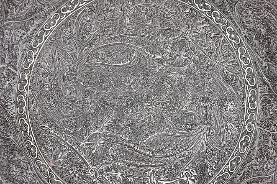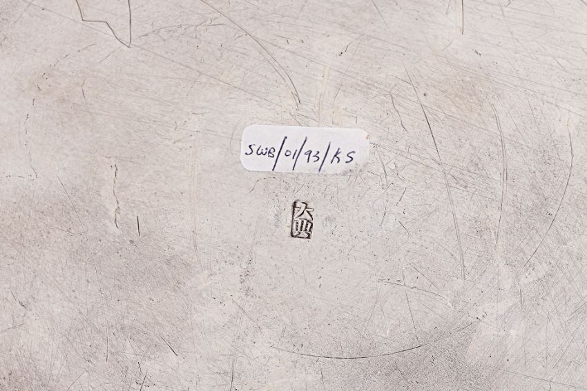 Large round basin, silver chasing and repousse, centre with two flying phoenix and peony, ruyi head border, walls show four cartouche panels of phoenix and peony, rim border with eight auspicious Buddhist emblem panels interspersed with peony, butterfly and phoenix, Ta Hing shopmark character mark to underside.