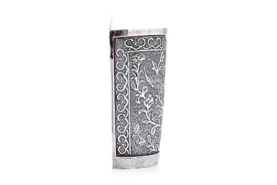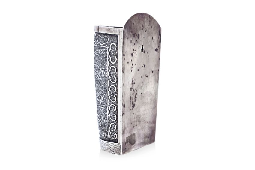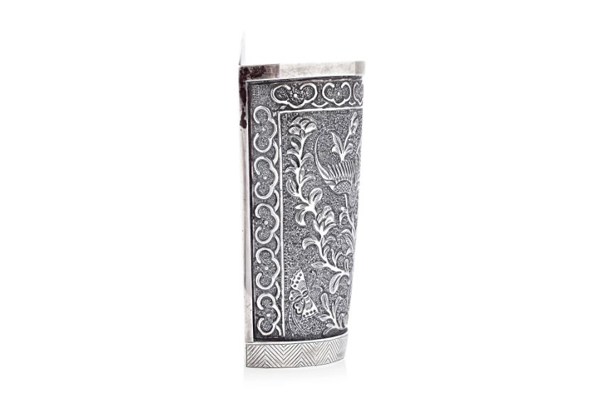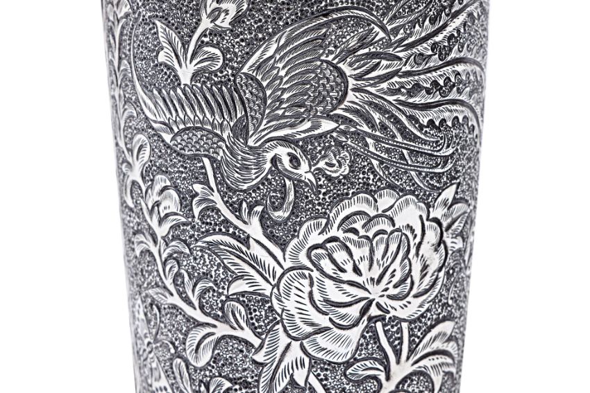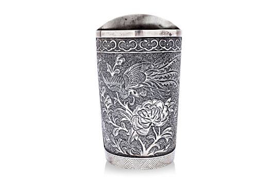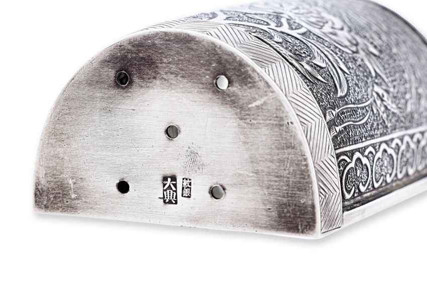 Silver, chasing and repousse, half-round rectangular form, from panel decorated in flying phoenix, over peony and butterflies to each side, ruyi head border to geometric zig-zag patterned lower, five drainage holes and Ta Hing character shopmark to base