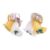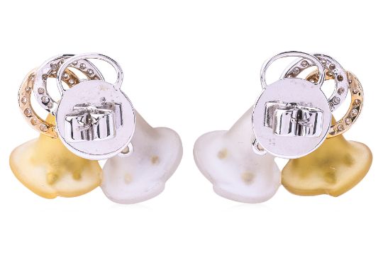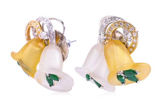 Featuring jade pieces mounted in a two tone gold setting marked '18K' to the stud backings, with glass 'calla lily' petals, accented with round brilliant cut diamonds totalling approximately 0.30 Cts.