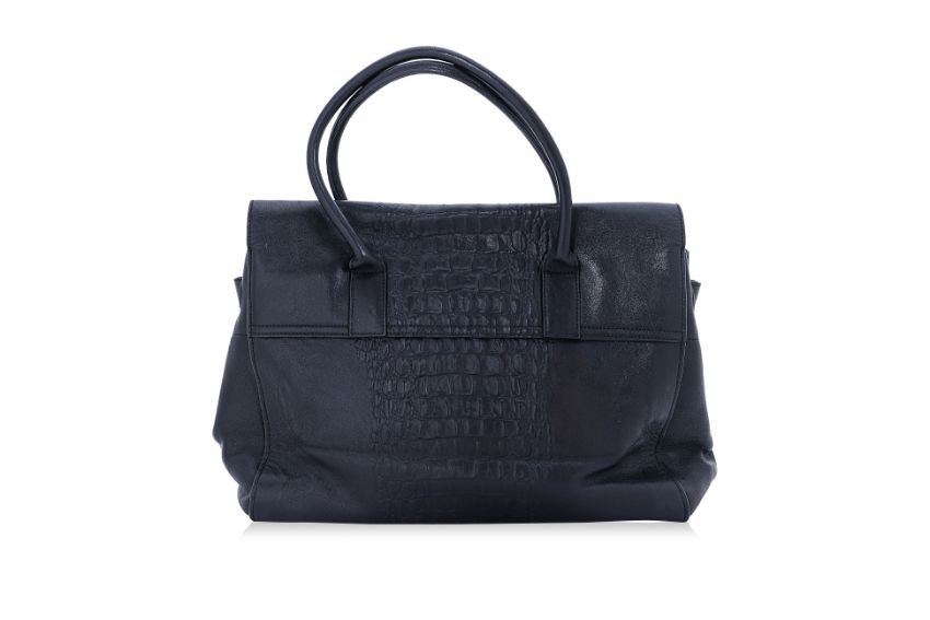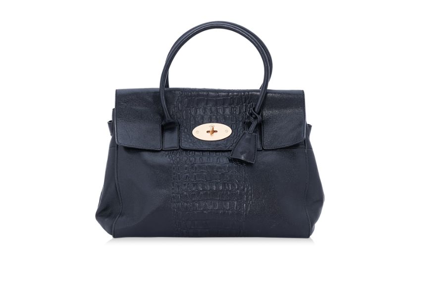 Comprises embossed leather in black with suede-lined interior, featuring the brand's signature golden postman lock, one zip pocket and two slip pockets.