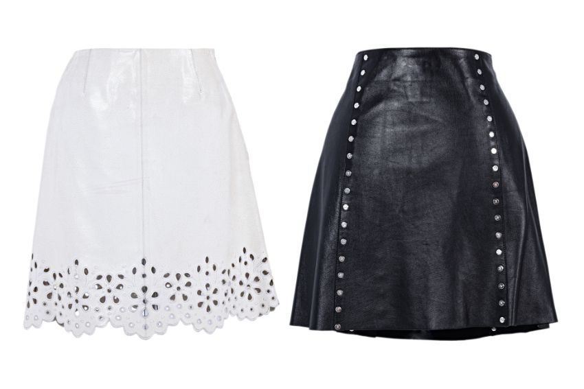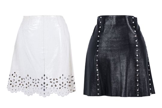 Comprising a white leather broderie skirt with zip closure at side, and a black leather triomphe studded skirt with snap button closure at front.