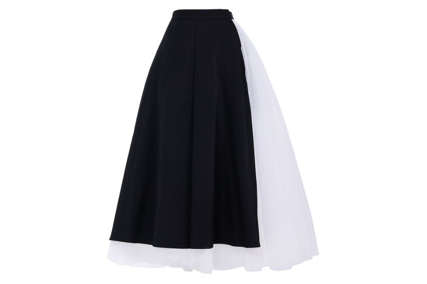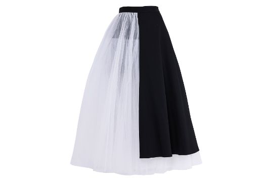 Comprising a mid-length woven wool skirt in white and black, asymmetric construction, pleated tulle and organza underlay, zip closure at side, tonal cupro satin partial lining and tonal hardware.
