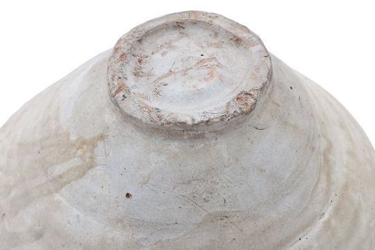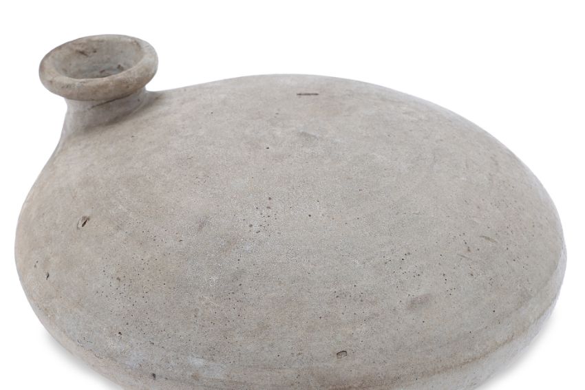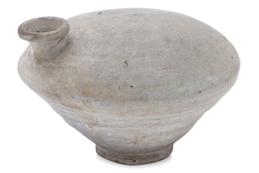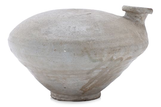 Joseon Dynasty, circa 15th Century, the vessel of compressed circular form with filling hole/spout to one side, covered in a greyish-cream glaze, foot unglazed