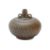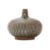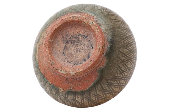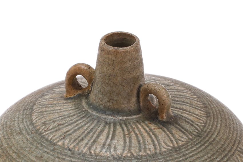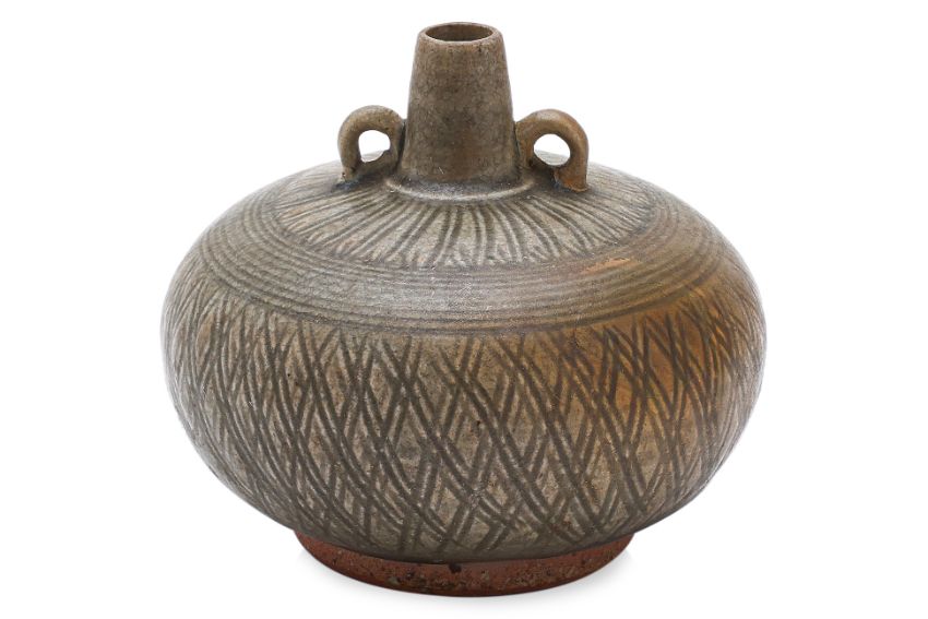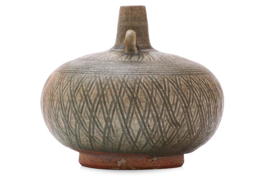 Sawankhalok, 14th-15th Century, thickly potted globular squat form with two ring handles and tapering conical spout, blueish-green glaze, underglaze carved lattice pattern, numerous rings to shoulder and flower petal lappet border below neck, wide upright foot rim and firing ring to base