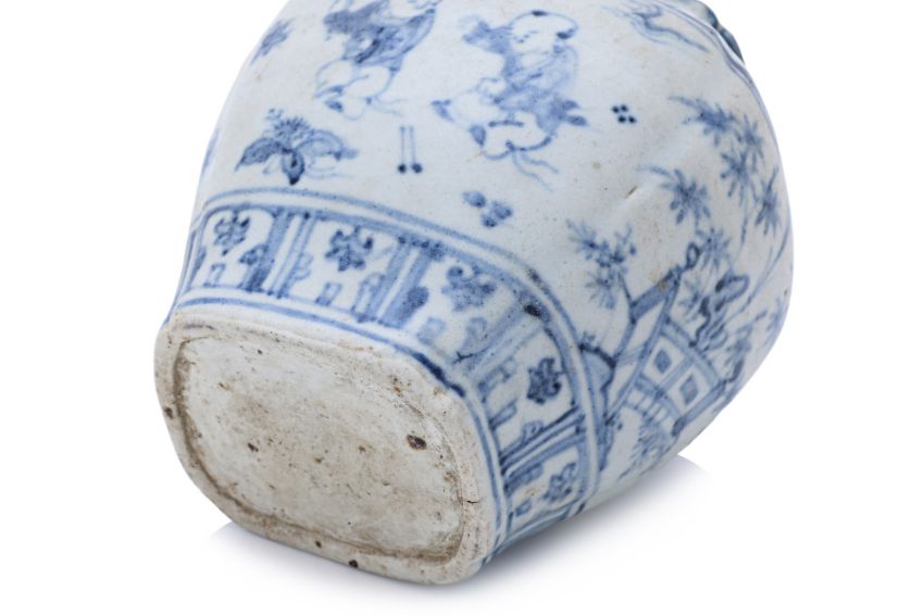 Ming Dynasty, 16th/17th Century, baluster, of rectangular section, decorated with four boys playing in a garden setting, the side panels decorated with flowering foliage and fences, between lappet and line borders