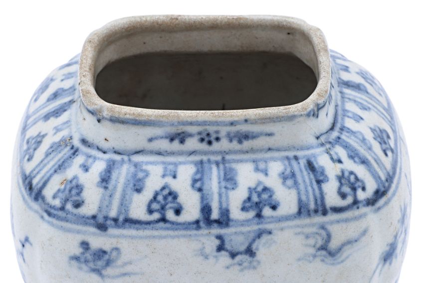 The jar appears intact, with some wear and degradation to the glaze and staining at rim.
