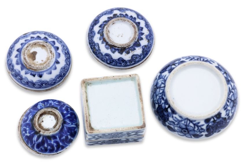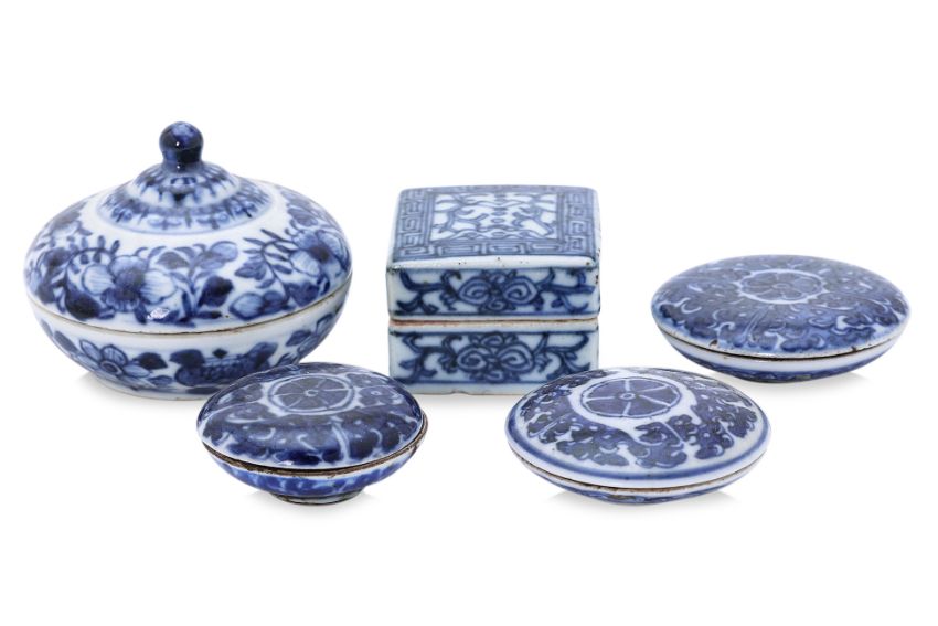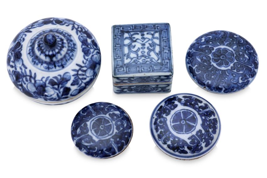 Ming Dynasty and later, three flat circular examples with dense decoration of mythical creatures and central medallion, a square box and cover decorated in key fret border, scrolling foliage and an auspicious bat; and one larger circular box with domed cover, most likely later