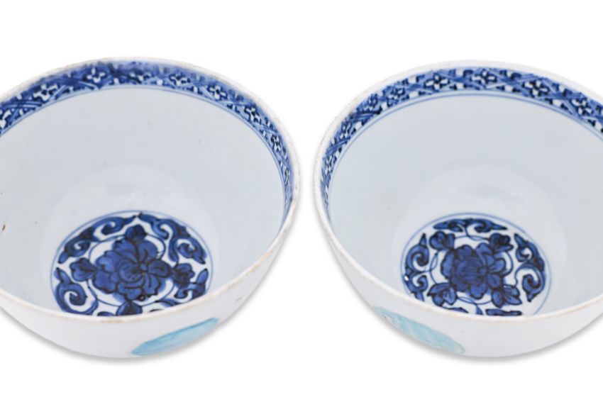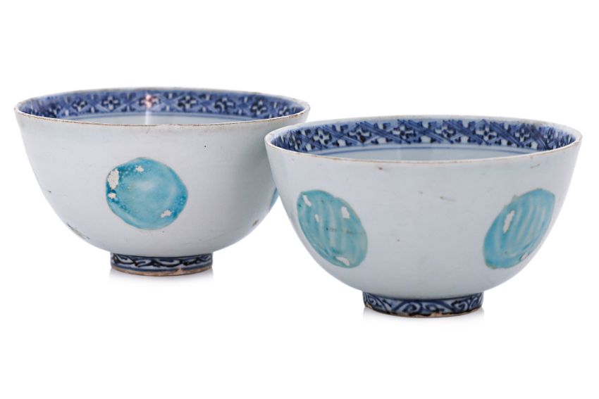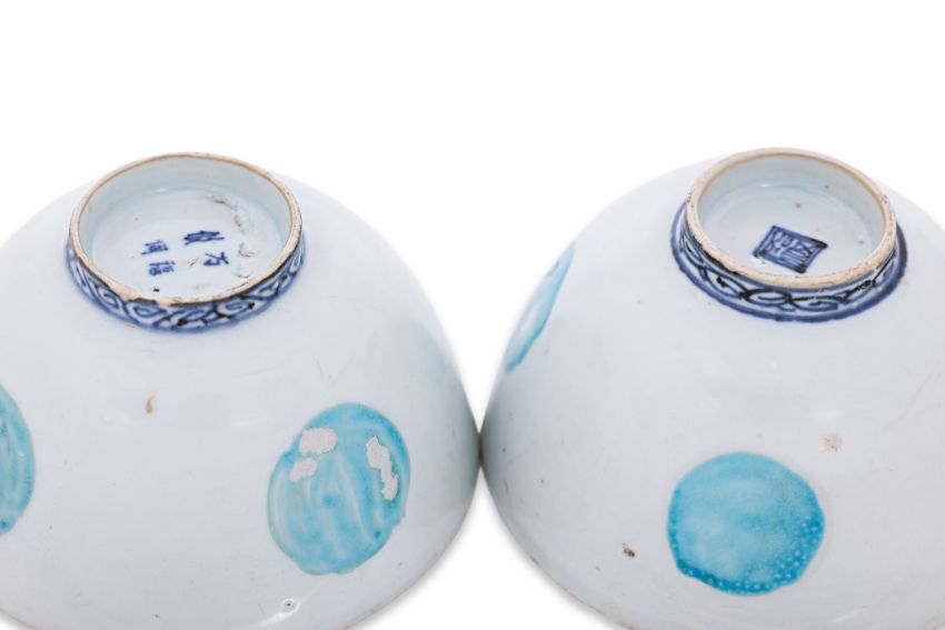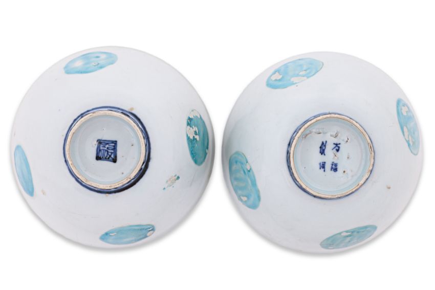 Some occasional fritting to the rim and foot rim on both, and green enamel glaze loss.