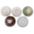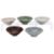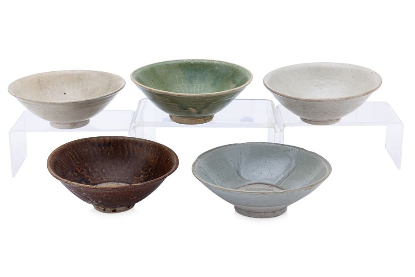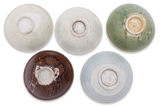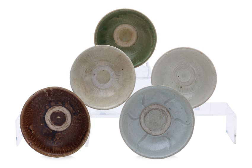 14th-15th Century, variously glazed in apple green, dark brown, pale greyish-green, and pale bluish-green, three examples with impressed underglaze petals, and one with combed decoration and lobed rim; all have stacking rings to the well