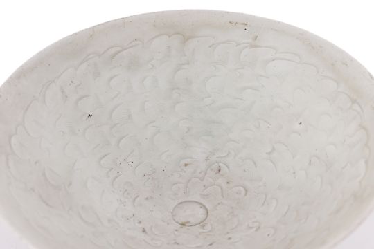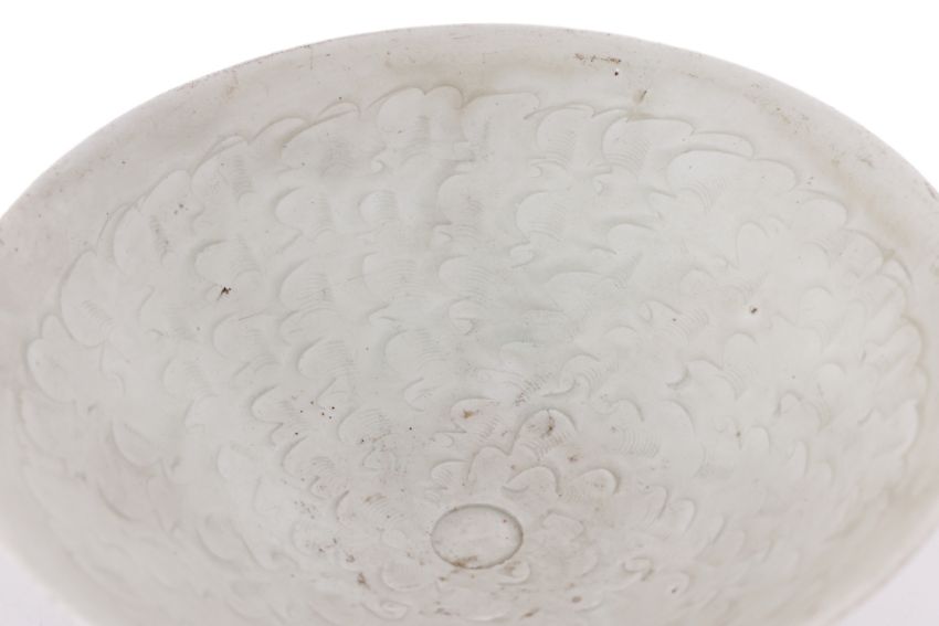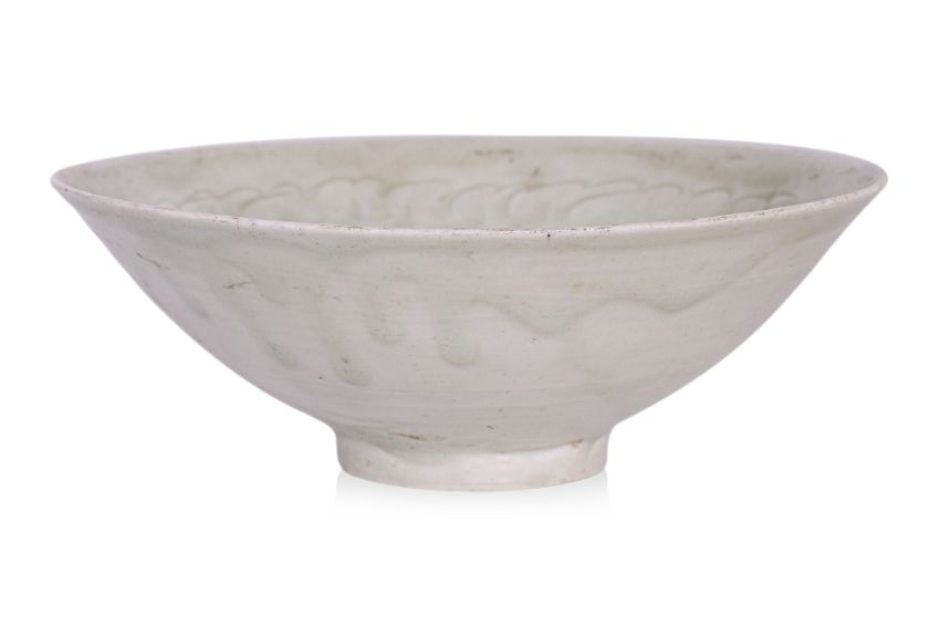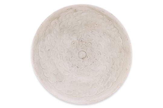 Song/Yuan Dynasty, pale grey-green glaze, slightly rounded sides, the interior decorated with incised clouds, small ring to well, thin raised foot rim with unglazed greyish base