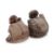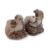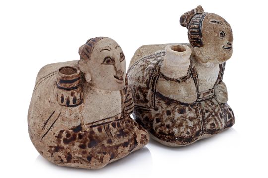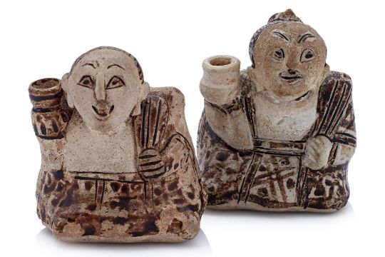 Sawankhalok, 15th-16th Century, two hunch-backed kneeling figures holding a hollow vessel and fan, incised and brown glazed features