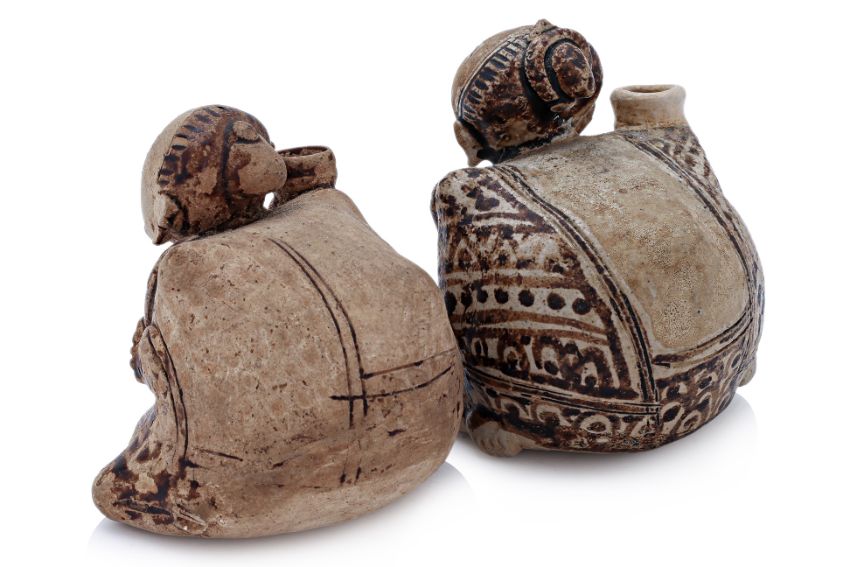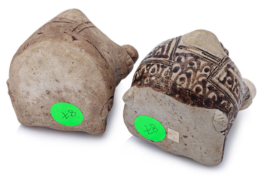 The hollow vessel on one example appears to have been restored. The glaze on both has flaked and degraded.