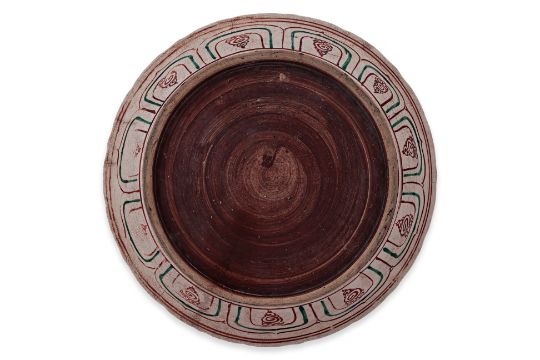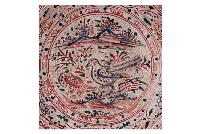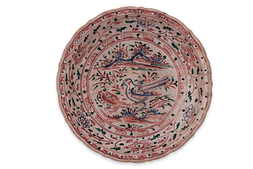15th Century, decorated to the centre with two birds in foreground, one in underglaze blue, the other in red, the cavetto surround of scrolling foliage with green enamelled leaves, barbed unglazed rim, exterior tri-coloured lappet border, and has a chocolate brown wash to base