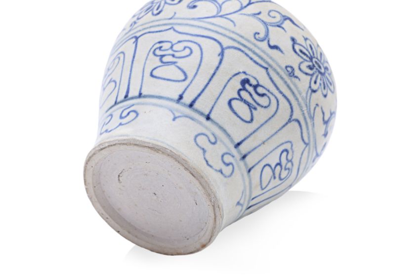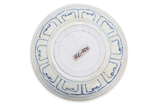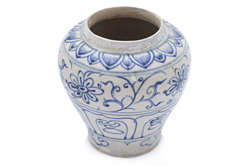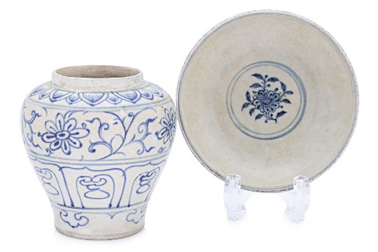 15th Century, a small baluster jar decorated in chrysanthemum and vines, a lappet border and lotus petal border to the shoulders, together with a small dish with sloping sides and an inverted rim, central peony medallion to the well, scrollwork and lappet bands to the outer