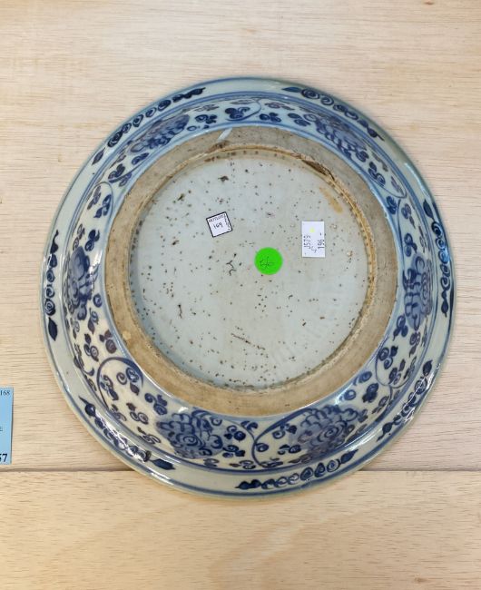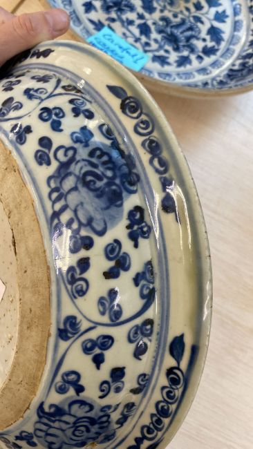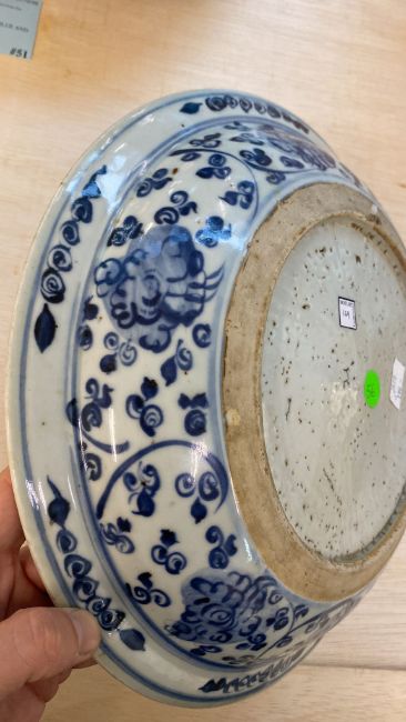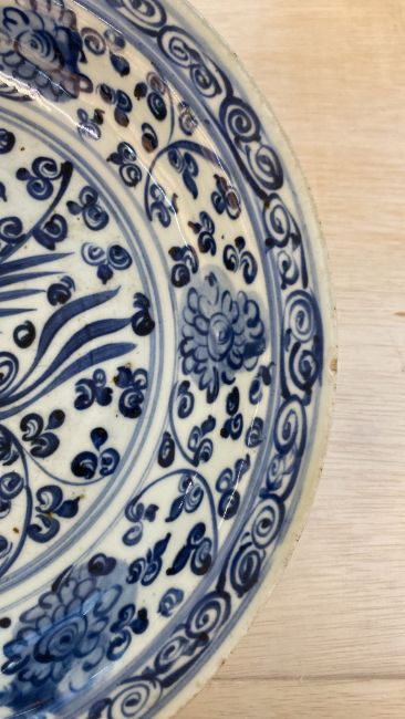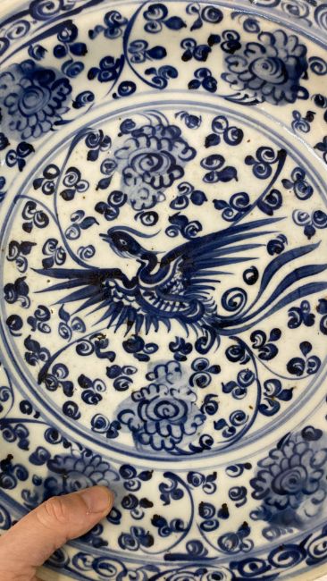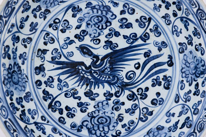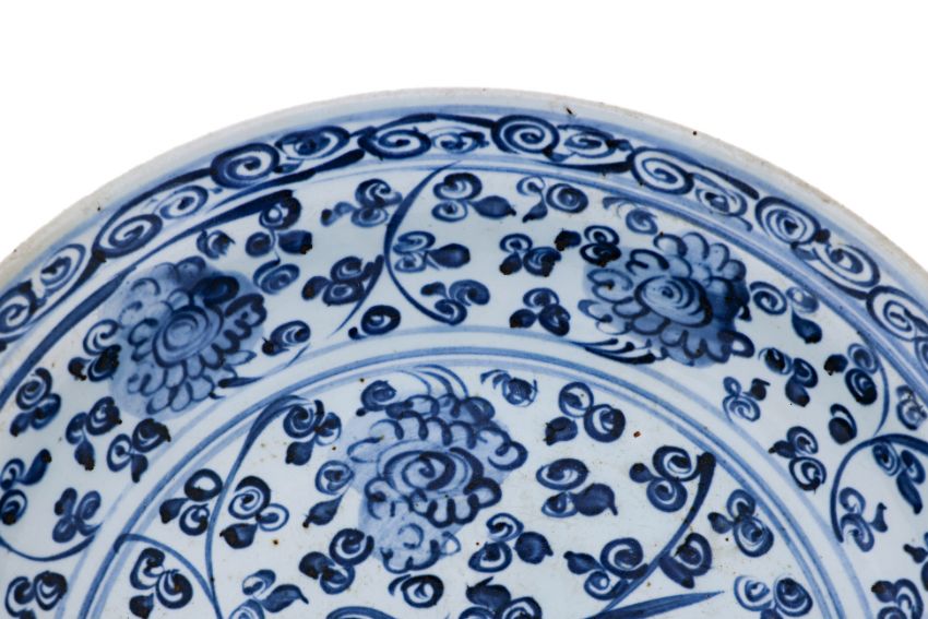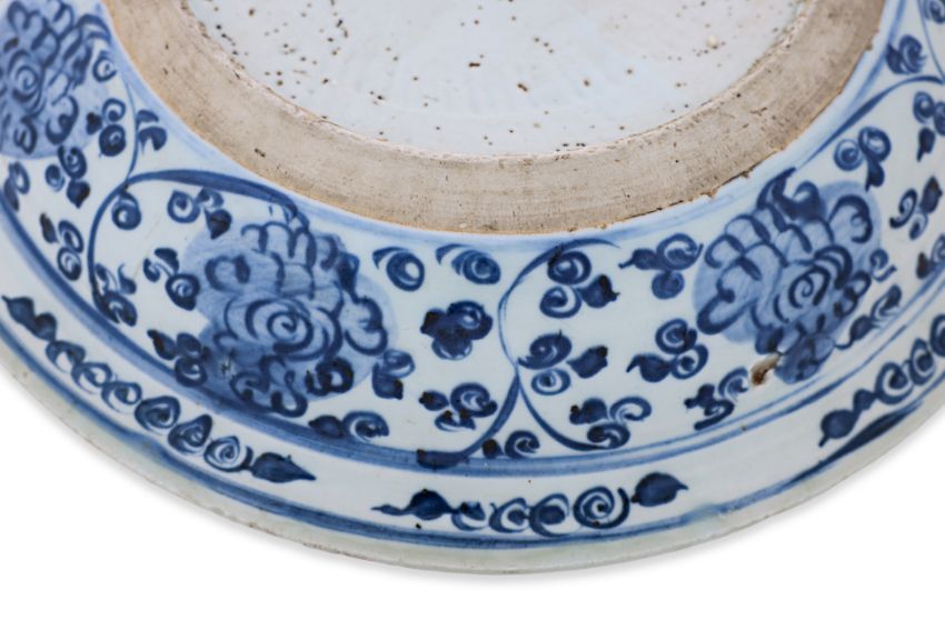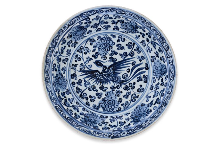 Ming Dynasty, circa 1500, painted with a central phoenix amongst flowering plants, the interior and exterior walls decorated with similar foliage, everted rim with scrollwork, inverted unglazed foot rim and glazed to base