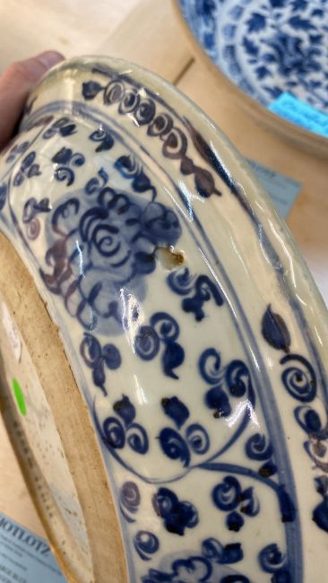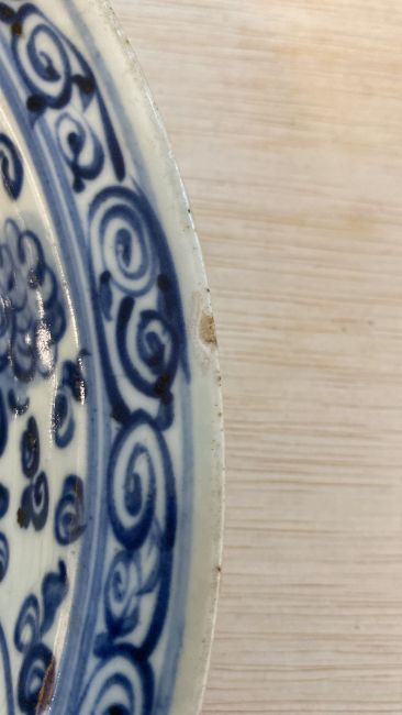 There is a small chip and some fritting to the rim. A couple of glaze/firing flaws, small firing flaw or damage to inside of foot rimpitting to the glaze on underside of base