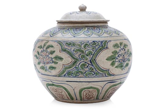 15th Century, of baluster form with rounded sides, domed cover with a lotus bud finial, decorated in blue underglaze and green and red enamels, four quatrefoil peony panels between red trellis ground and stylised clouds, a band of polychrome lotus petals to the shoulder and lappets, recessed foot and brown wash to the base