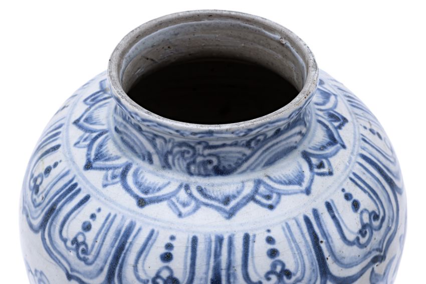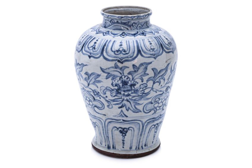 15th Century, densely decorated in blooming peonies and ruyi heads, lappet borders and lotus borders below a thinly potted neck and mouth rim, brown wash to the outer edge of the foot, unglazed recessed base