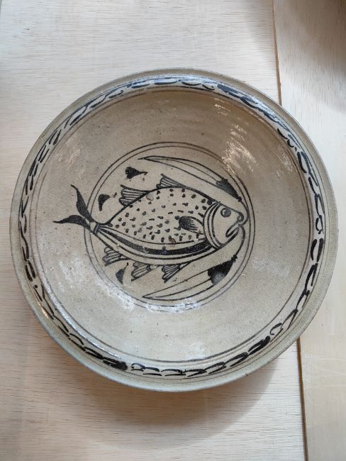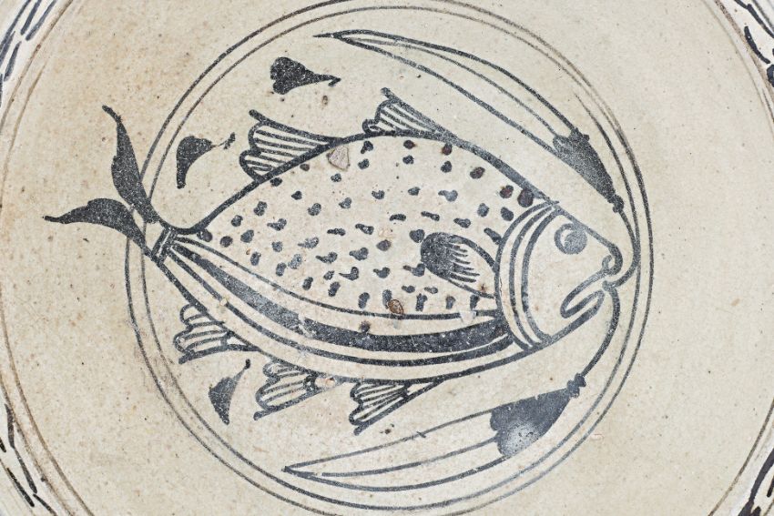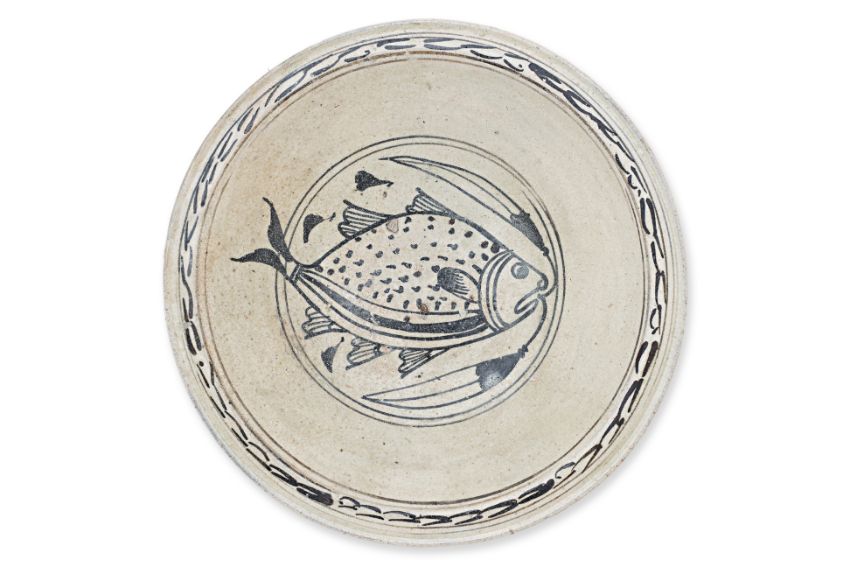 Sukhothai, 13th-14th Century, a shallow stoneware dish, cream slip decorated in dark brown image of fish and clear overglaze, a flat wide rim with twin streak border