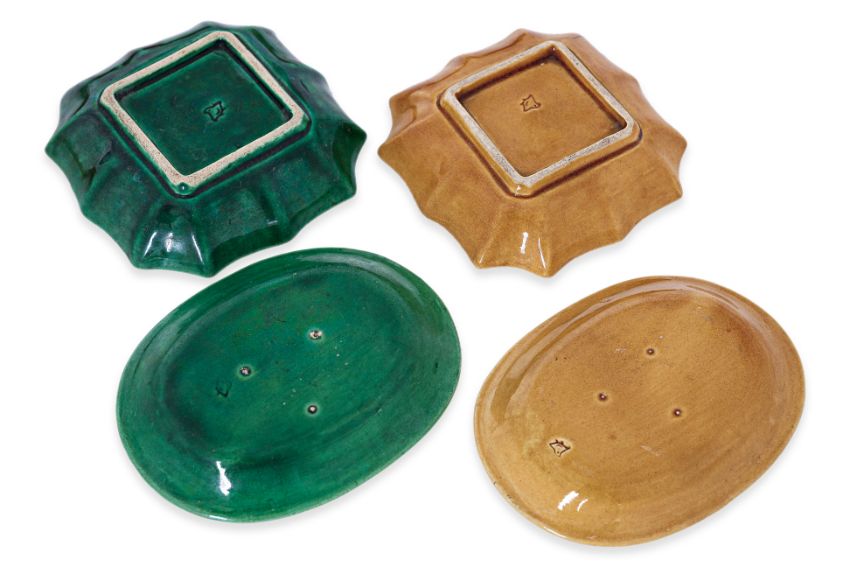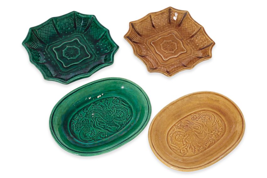 One yellow dragon decorated dish has a hairline, two additional yellow dragon dishes have chips to the foot rim, the green oval shaped dish has abrasions to the top, and the yellow geometric decorated dish has a hairline.