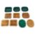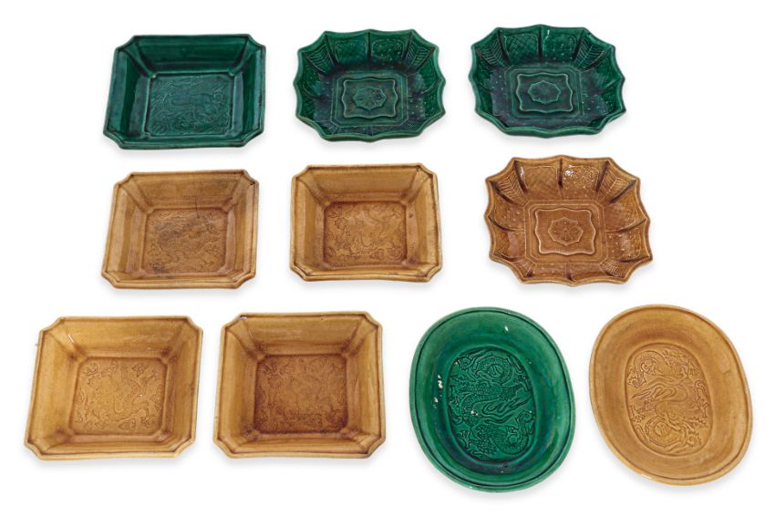 Late Qing to Republic Period, green and amber-yellow glazed dishes, variously shaped, seven examples underglaze decorated with an impressed dragon chasing pearl, five with impressed mark to base